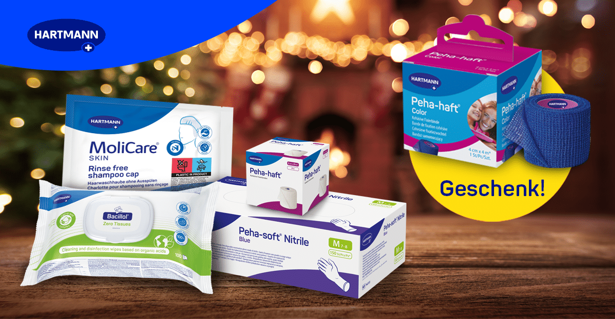 Eindejaarsactie Medische Vakhandel: gratis 20 Peha-haft* 4 x 4 cm zelfklevende fixatiezwachtels bij aankoop van € 250 aan Hartmann-producten